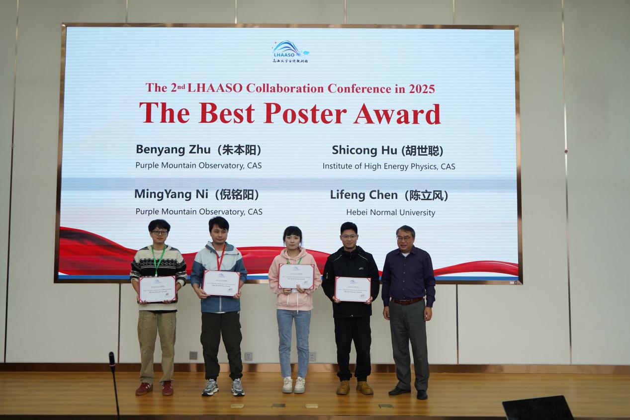 LHAASO合作組會議的墻報,既是合作組內年輕學生與學者展示研究成果、鍛煉學術能力的核心平臺,也是激發(fā)合作組內所有成員新研究方向、碰撞創(chuàng)新思路的重要載體。本次會議有效墻報47份,每份墻報在大會進行了4分鐘的快速介紹,還有專門時段進行充分講解、討論。經過物理協(xié)調委員會及會議參會者的投票,最終評選出4個優(yōu)秀海報,獲獎者為來自紫金山天文臺的朱本陽和倪銘陽、高能所的胡世聰、河北師范大學的陳立風。